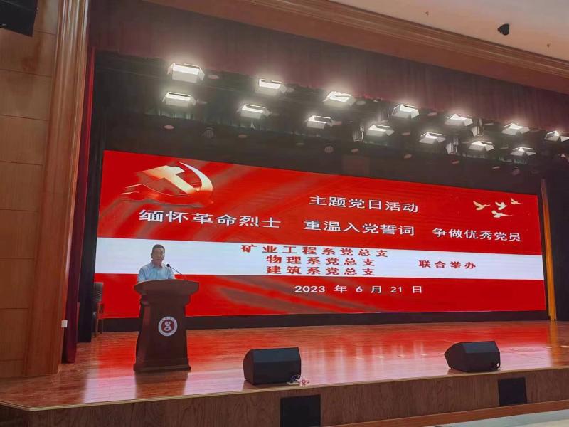在学校全面深入开展学习贯彻习近平新时代中国特色社会主义思想主题教育之际,矿业工程系、物理系、建筑系三个系部于6月21日晚19:30在弘智楼一层报告厅联合举办“缅怀革命先烈,重温入党誓词,争做优秀党员”主题党日活动。本次主题党日活动由矿业工程系党总支书记薛淑萍统筹、物理系党总支书记贺一华主持,三个系部近300名师生党员同志参加本次活动。