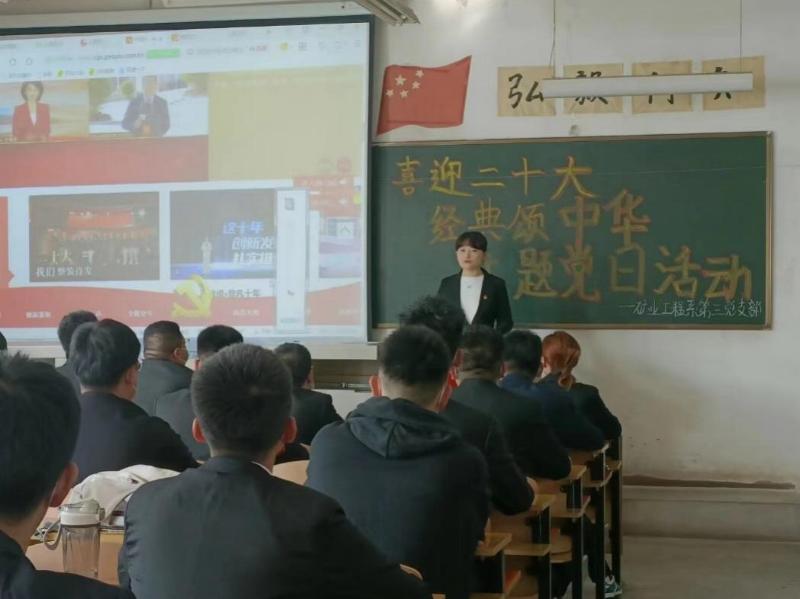 党的二十大是在迈上全面建设社会主义现代化国家新征程、向第二个百年奋斗目标进军的关键时刻召开的一次十分重要的大会。为热烈庆祝党的二十大隆重召开,10月16日下午,矿业工程系学生第三党支部在3号教学楼202教室举办了“喜迎党的二十大 经典颂中华”的主题党日活动,支部全体党员参加了此次活动。