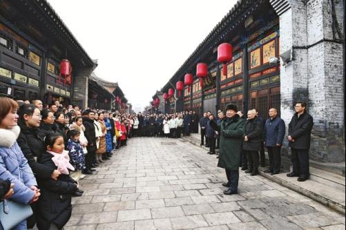 古城南大街年味浓郁。习近平沿街巷察看古城风貌,走进平遥牛肉店、推光漆器店、东湖老醋坊,了解当地文化遗产保护利用和开展特色经营情况,并购买了平遥牛肉、饺子醋等年货,还参与了陈醋发酵打耙。他指出,要做优秀传统文化传承者,保护好推光漆器等文化瑰宝,把富有民族特色的传统文化产业发扬光大、推向世界。现场群众纷纷向总书记问好,习近平向大家挥手致意,给大家拜年。