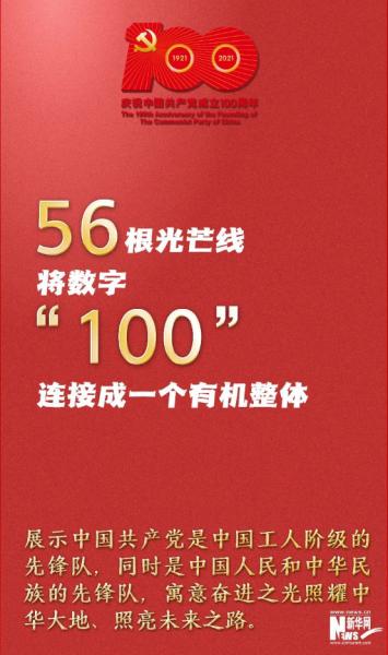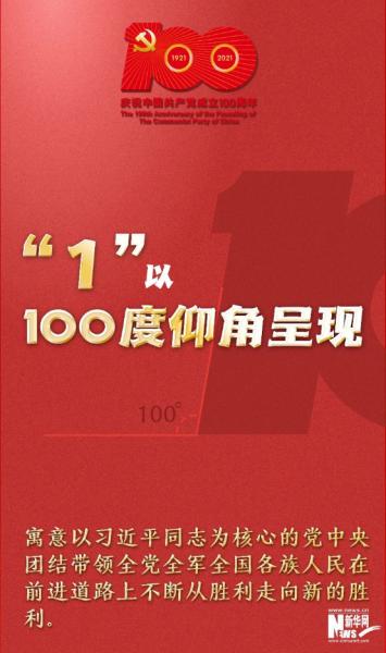 数字“100”构成标识基本造型,“1”100度仰角呈现,寓意以习近平同志为核心的党中央团结带领全党全军全国各族人民在前进道路上不断从胜利走向新的胜利。党徽位于标识左上方,寓意中国人民在中国共产党的领导下同心同德、砥砺前行,不断创造新的人间奇迹。●56根光芒线将数字“100”连接成一个有机整体,展示中国共产党是中国工人阶级的先锋队,同时是中国人民和中华民族的先锋队,寓意奋进之光照耀中华大地、照亮未来之路。嵌入数字“1921”代表100年前中国共产党的创始,“2021”代表中国共产党团结带领中国人民实现第一个百年奋斗目标、开启第二个百年奋斗目标,两个圆形寓意党和国家事业犹如滚滚历史车轮,势不可挡,勇往直前。