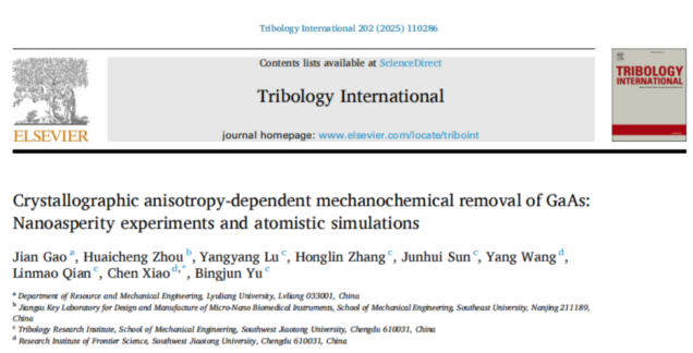 我系青年博士高健老师取得重要科研突破,其研究成果以 “Crystallographic anisotropy-dependent mechanochemical removal of GaAs: Nanoasperity experiments and atomistic simulations” 为题,在机械领域权威期刊《Tribology International》上发表。该期刊为中科院分区 SCI 一区、Top 期刊,影响因子达 6.1(DOI:10.1016/j.triboint.2024.110286 )。