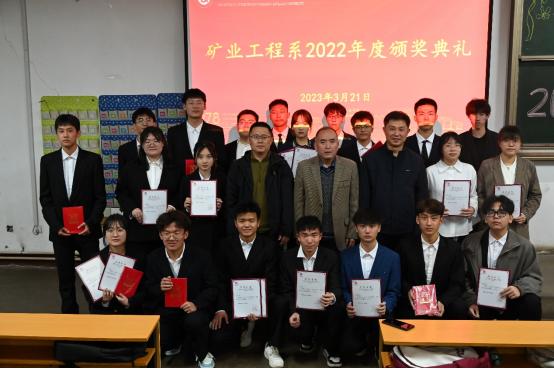 为进一步贯彻落实立德树人根本任务,充分发挥榜样示范引领作用,2023年3月21日,分团委在1c102举办了2022年度矿业工程系颁奖典礼。宋宏志、李辉、王晓蕾等系领导出席了本次典礼。分团委、学生分会各部门负责人及2022级部分同学参加了典礼。