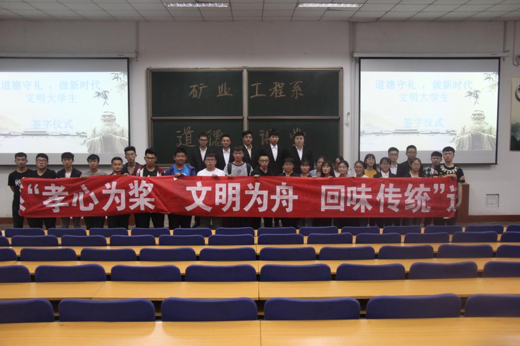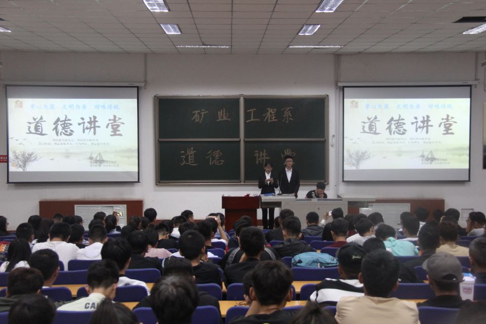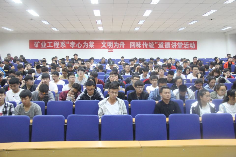 为全面贯彻落实党的十九大精神,加强社会主义核心价值体系建设,弘扬优秀传统文化,体会道德精神之崇高,建设文明和谐的校园。矿业工程系积极响应中共ok138太阳集团委员会宣传部号召,于2018年5月5日在1C-201教室举办了以“孝心为桨,文明为舟,回味传统”为主题的道德讲堂活动。矿业工程系党总支副书记薛淑萍老师、矿业工程系辅导员吴浩杰老师出席本次活动。