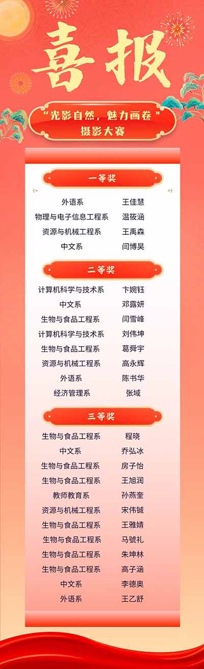 我系分团委文化宣传部举办了“光影自然,魅力画卷"主题摄影大赛,面向全校学生征集优秀摄影作品。此次摄影大赛2024年11月21日开启,为期一周,全校各系学生积极投稿,踊跃参与。