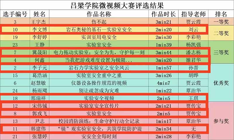 在微视频大赛中,我系同学在刘云、王琪、贾传宝、潘志栋等老师的指导下,创作了一系列以实验室安全、科研探索为主题的微视频作品。最终,我系参赛作品有8项进入最终决赛评审,其中二等奖1项、三等奖和优秀奖各2项、参与奖3项。