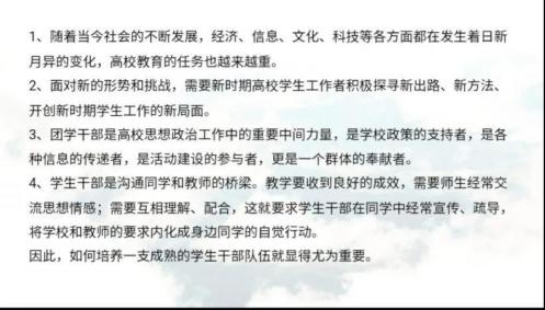 5月8日下午19:30,由曹莉荣老师在线上给同学们讲授《团学组织的基本职能和学生干部的功能发挥》,教导学生干部应起到模范引领作用,修身立己,奋发进取,勇于担当。