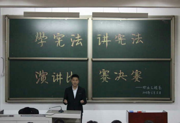 2018年6月8日19:30-21:00,矿业工程系于二区-102举行了“学宪法,讲宪法”演讲比赛决赛。12位从初赛中脱颖而出的选手依次上台演讲。