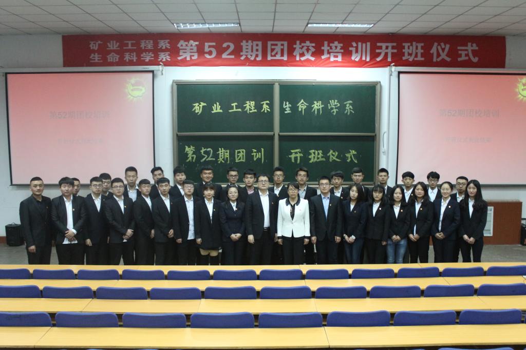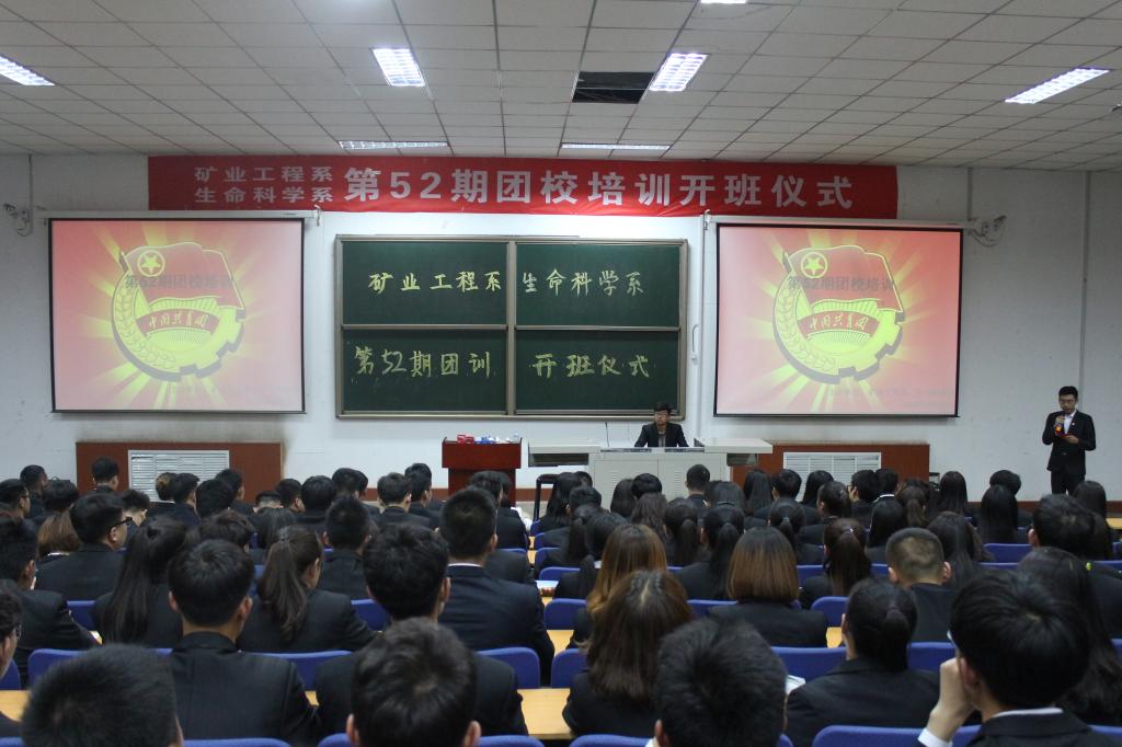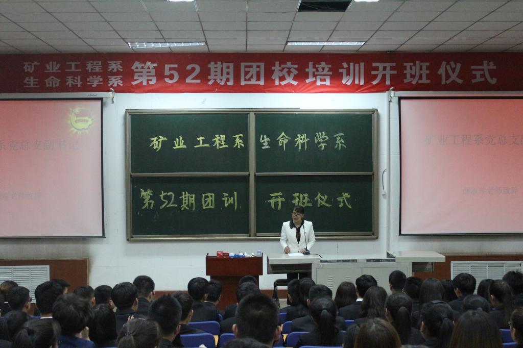 2018年4月25日晚19:30,矿业工程系、生命科学系于三区2c-201教室联合举行第52期团校培训开班仪式。矿业工程系党总支副书记薛淑萍老师、分团委书记马骉老师和生命科学系分团委书记刘泽鑫老师出席了本次开班仪式。 仪式伊始,同学们全体起立,奏唱团歌,重温入团誓词。随后矿业工程系党总支副书记薛老师致开班词,并给予参与此次团训的同学们以厚望;接着生命科学系学生代表上台发言,对参会共青团员提出了若干要求,并鼓励同学们一起学习,共同奋进。 至此,第52期团校培训开班仪式圆满结束 。