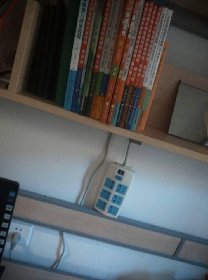 4.插座问题:现规定每个宿舍只能使用两个插板,上铺学生不得使用插板。若检查时发现宿舍内超过规定数量,予以没收处理。两个插座分别挂在书架上方,多余电线塞入桌子底下,具体要求如图所示。