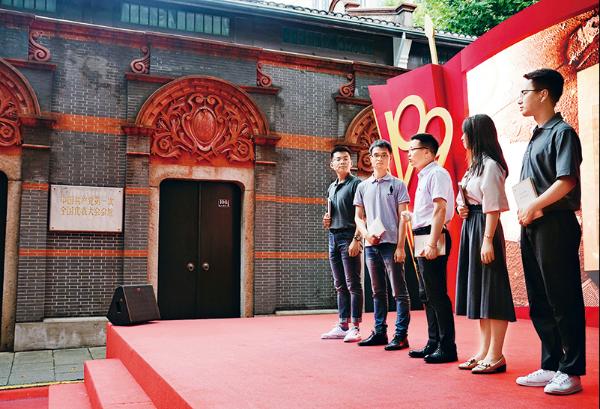2020年6月29日,“新时代答卷人——上海市教育系统庆祝中国共产党成立99周年暨学生爱国主义教育主题活动”在中共一大会址前举行。来自复旦大学、同济大学、上海建桥学院、上海市曹杨第二中学等8所学校的200余名师生代表参加活动,通过情景讲述、现场教学、集体朗诵等形式,庆祝中国共产党成立99周年,展现广大上海学子的爱国情、强国志。图为复旦大学师生代表在一大会址前展示情景教学。(新华社记者 刘颖/摄)