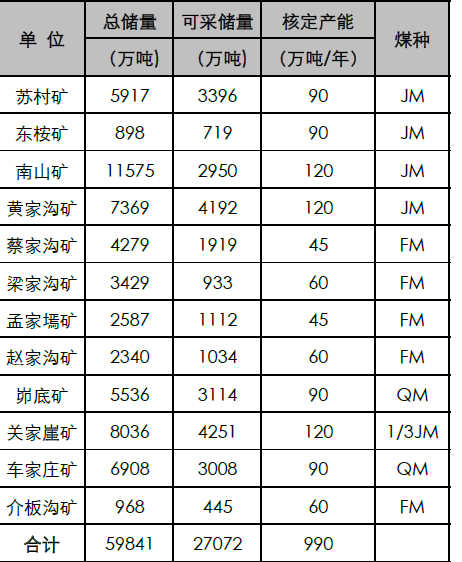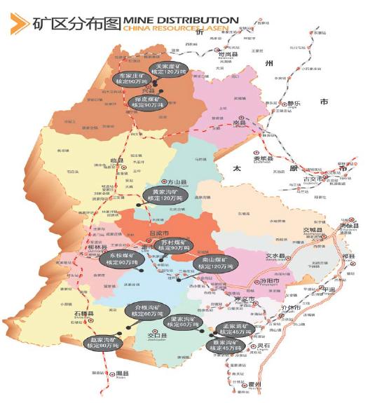 目前共有12座主体矿井,分别位于吕梁兴县、临县、中阳、交口、石楼,井田面积达92.5平方公里,保有资源储量5.98亿吨,可采储量2.7亿吨,核定产能990万吨/年。