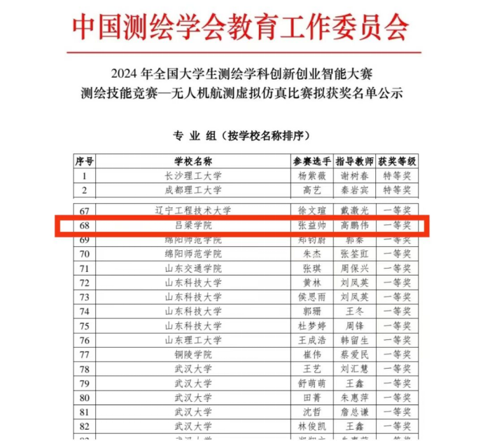 我系在本次比赛中排除困难、创造条件积极组织学生参赛,比赛团队凭借扎实的专业知识和卓越的创新能力,经过激烈的角逐,在本次比赛中斩获佳绩——“测绘技能竞赛-无人机航测虚拟仿真比赛一等奖”。