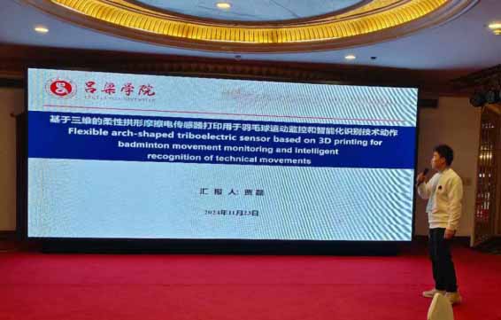 在本次会议上,贾磊同学做了快闪报告,汇报了在薛淑萍副教授、杨云博士的指导下的科研成果“Flexible arch-shaped triboelectric sensor based on 3D printing for badminton movement monitoring and intelligent recognition of technical movements”,获得同行专家的高度关注。会议期间,贾磊、王子恒同学投稿了墙报介绍了该项科研成果,积极参加分会讨论并与国内外顶尖学者进行了深入的学术交流与研讨,提高了自己的学术水平,也彰显了我系应用型创新人才的培养质量。