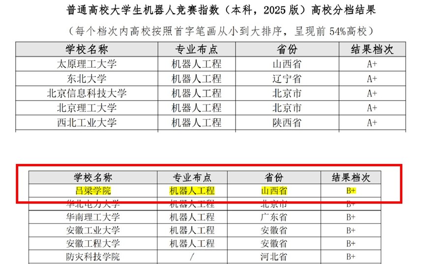 2025年5月23日,高校教师教学发展研究国家级虚拟教研室联合中国自动化学会、浙江大学机器人研究院、浙大城市学院高等教育数智评价研究中心,正式发布第6轮 “普通高校大学生机器人竞赛指数”(本科,2025 版)。ok138太阳集团机器人竞赛表现出色,被评定为“B+”档次,排序进入全国高校前10%,位居全省第四。