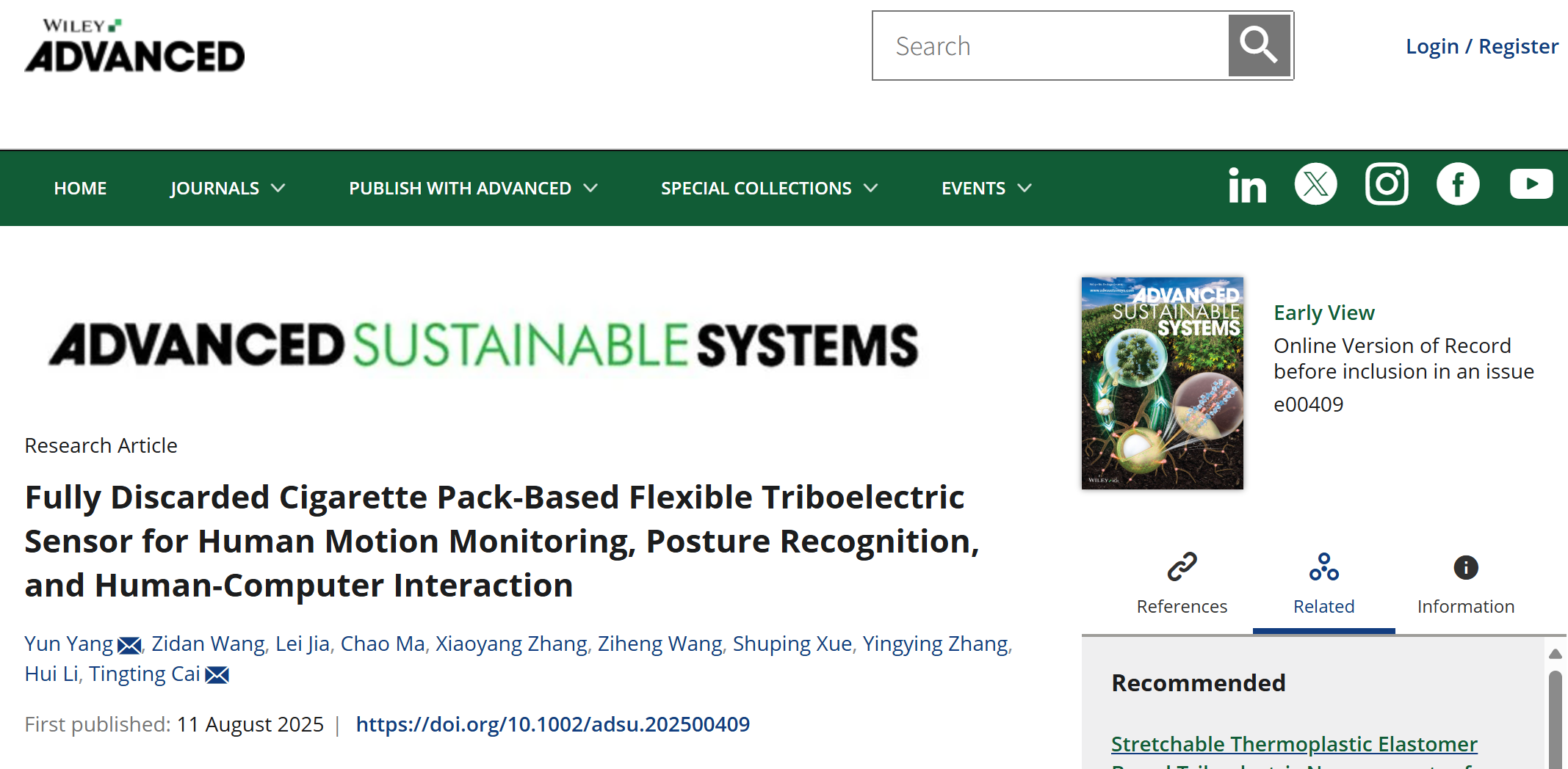 近日,我系杨云副教授、薛淑萍副教授、化工与材料工程系蔡婷婷副教授所属的智能感知与控制团队在期刊《Advanced Sustainable Systems》上发表了题为“Fully Discarded Cigarette Pack-Based Flexible Triboelectric Sensor for Human Motion Monitoring, Posture Recognition, and Human-Computer Interaction”的研究论文。