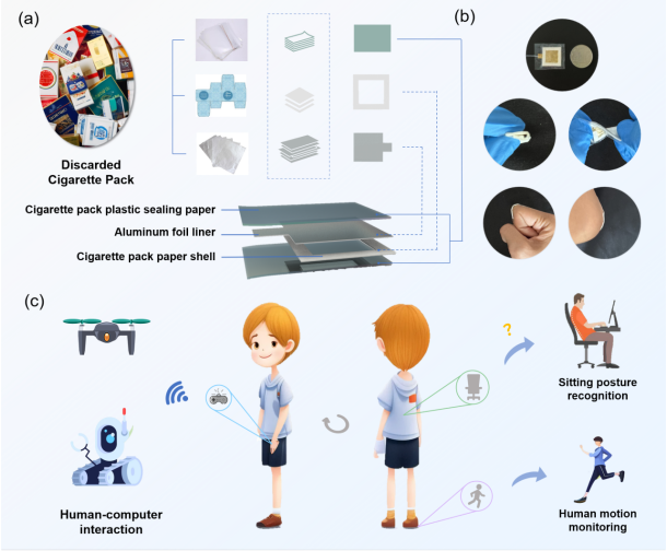 烟草产品废弃物的处理已成为一个紧迫的环境问题。摩擦纳米发电机(TENG)因其能够利用多种材料进行传感和能量收集,为废弃香烟包装的资源化利用带来了可能性。然而,已报道的基于废弃物的TENG存在废弃物利用率低、制造成本高等问题。为了应对这一挑战,提出了一种完全基于废弃香烟包装盒的柔性摩擦电传感器。该传感器原材料仅为烟草包装的主要废弃物,制备工艺简单,兼具环保与经济优势。该传感器对力具有的变化具有良好的灵敏度和稳定性。在人体运动监测、坐姿模式识别、人机交互等应用方面,该传感器表现出色。它能有效感知关节运动和多种动作产生的足底压力变化;结合线性支持向量机实现了对4种常见的坐姿模式识别准确识别,准确率达99.5%;基于该传感器集成了可穿戴遥控系统,实现了救援小车的远程交互。本研究为废弃香烟包装的高值化利用提供了新的解决方案,在智慧体育、智能家居、灾害救援等多领域具有广阔应用前景。