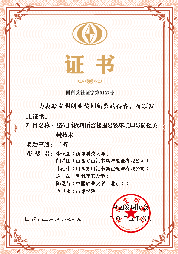 近日,中国发明协会公布2025年度“发明创业奖·创新奖”名单,我系青年博士卢卫永参与的科研成果《坚硬顶板切顶留巷围岩破坏机理与防控关键技术》荣获二等奖(证书号:2025-CAICX-2-T02)。这是我系首次获得该奖项,标志着我系在深部矿山安全开采领域的研究迈上新台阶。